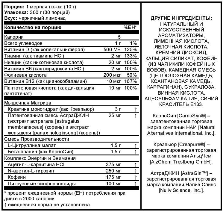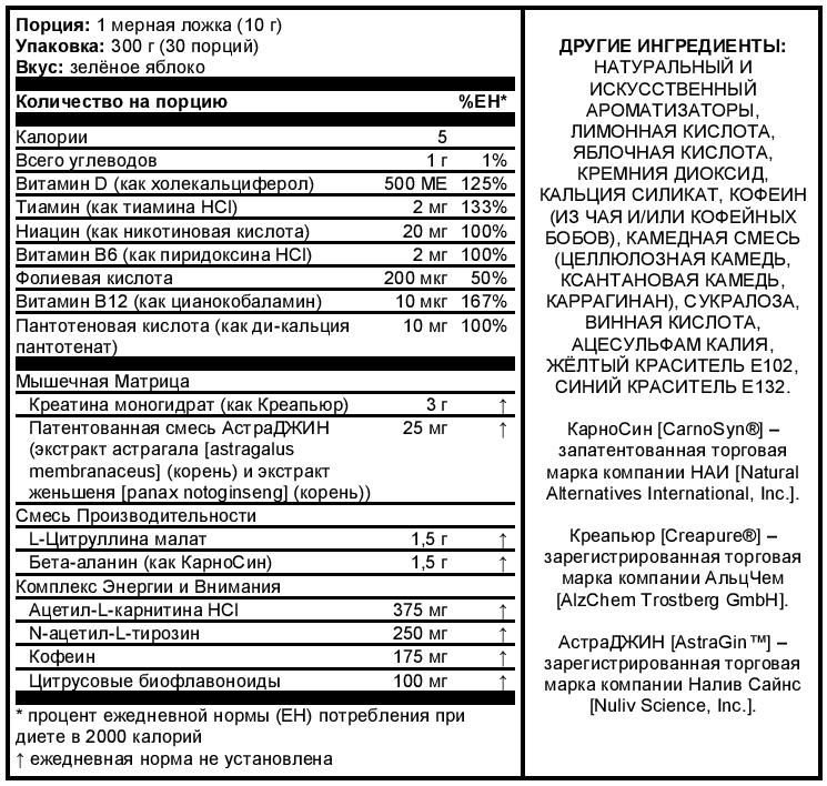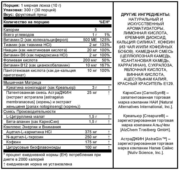 Внимание: Проконсультироваться с врачом перед приёмом этого продукта, если Вы принимаете любые лекарства или наблюдаетесь у врача из-за любых медицинских отклонений. Не использовать лицам в возрасте до 18 лет, беременным, планирующим забеременеть и кормящим женщинам, а также лицам с повышенной чувствительностью к кофеину, ниацину или бета-аланину. Не принимать кофеин из других источников во время приёма этого продукта, поскольку его чрезмерный приём может вызвать нервозность, раздражительность, бессонницу и учащённое сердцебиение. Бета-аланин и ниацин могут вызвать безвредное, временное ощущение покалывания кожи.