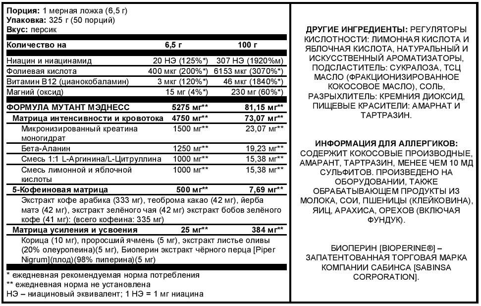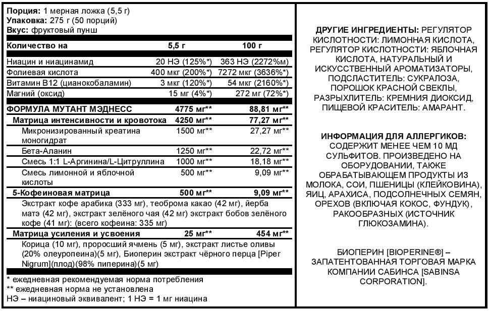 Мутант Мэднесс усовершенствовал нюансы пред-тренировочных комплексов и вывел их на совершенно новый экстремальный уровень! Разработанная исключительно для высоко интенсивных тренировок, эта экстра действенная формула будет сотрясать Ваше сознание. Мы предостерегаем Вас – используйте благоразумно!