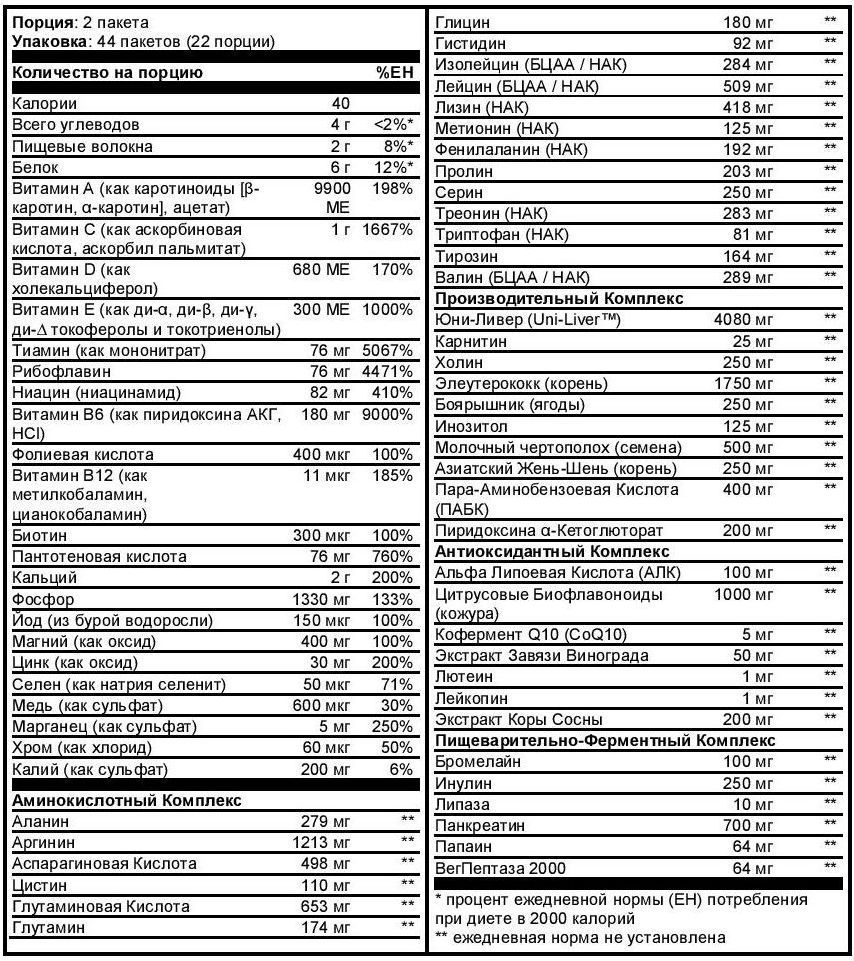 Другие ингредиенты: ди кальция фосфат, концентрат сывороточного белка (молочный), полимеры глюкозы, микрокристаллическая целлюлоза, аргинин α-кетоглюторат, высушенная Аргентинская печень (бычья), стеариновая кислота, магния стеарат, холина битартрат, кальция карбонат, кремния диоксид, ди-кальция пантотенат, лецитин (соевый), карнитина фумарат, кальция цитрат, люцерна, шиповник, рисовые отруби, петрушка, лопух, фармацевтическая глазурь. Произведено на оборудовании, обрабатывающем молочные, соевые, яичные и арахисовые компоненты.